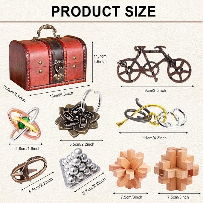 About This Puzzle box set:Selected 9 brain teasers, featuring 7 metal and 2 wooden puzzles. Each one serves a different... Read more