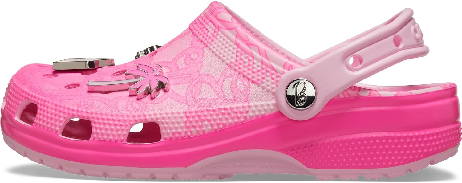• The new Barbie Classic Clog is the perfect statement shoe for fashion icons everywhere. This comfortably chic style comes in a pink hue with a stylish all-over monogram print. Make your look shine with elevated enamel Jibbitz charms featuring a Dream