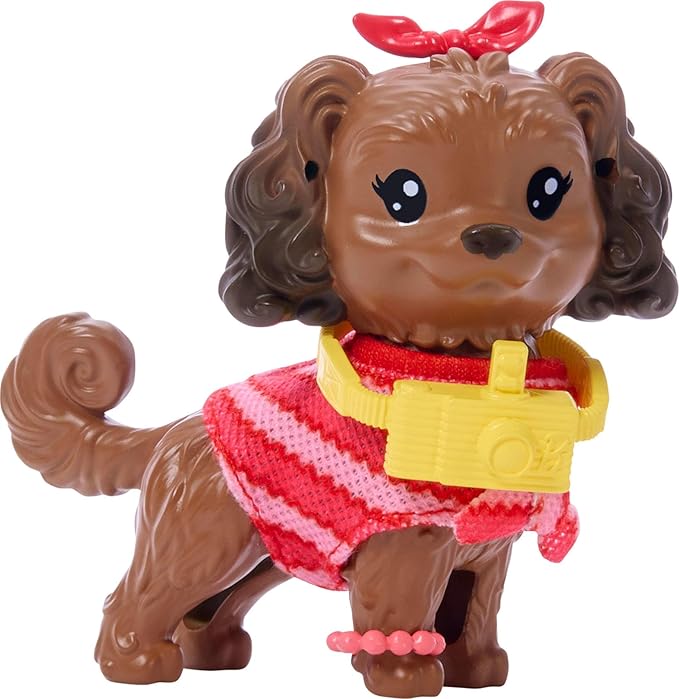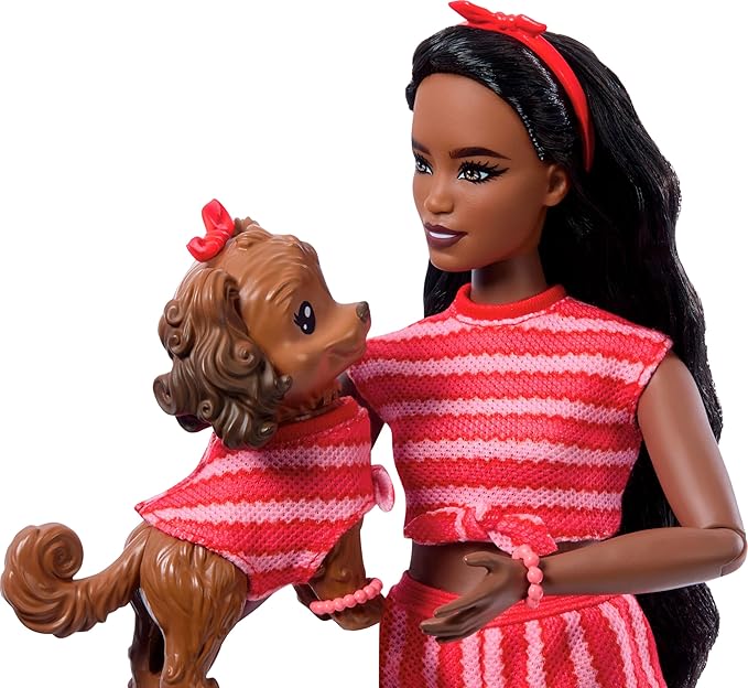 Barbie Twinning Looks Doll with Pet Dog in Matching Red Striped Clothes and Accessories for Both like Sunglasses and Headbands, Wavy Black Hair