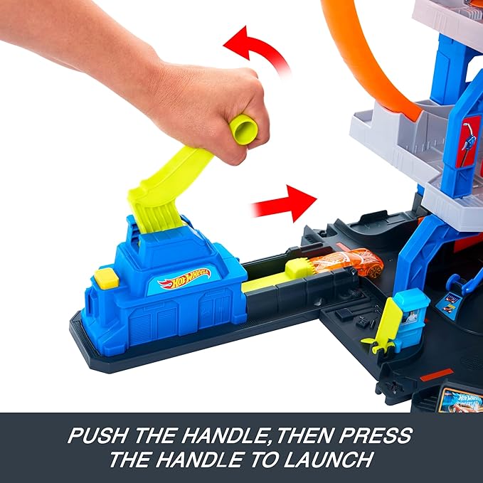About This Explore multiple levels of toy car play with the Hot Wheels Mega Loop Garage playset. Kids can slam... Read more