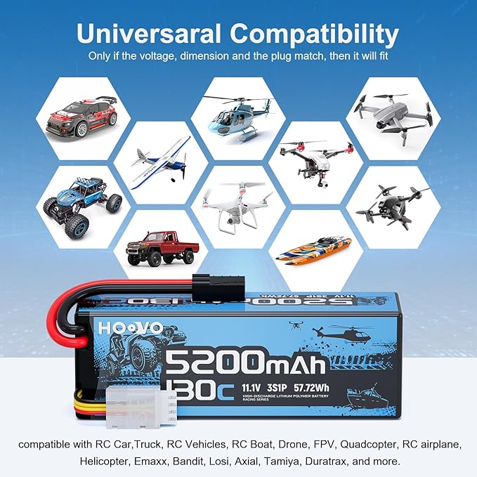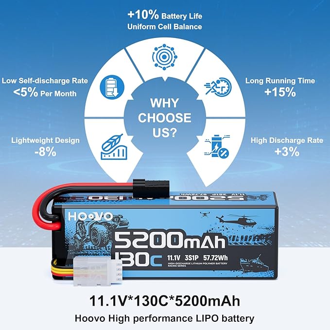 HOOVO 3S Lipo Battery,5200mAh 130C 11.1V Lipo Batteries Pack Hardcase with TR Plug,RC Battery for RC Car,Boat,Truck,Truggy Racing Hobby FPV Racing Model, 2 Pack