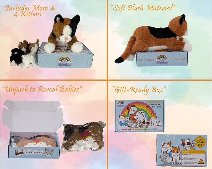 Chirpy Chums Classic Cat Family โ Mommy Cat with 4 Kittens โ 14โ Ultra-Soft Plush Stuffed Animal Toy โ Zipper Belly Surprise for Cuddles, Play & Gifts โ 5-Piece Kitten Set for Kids Ages 3+