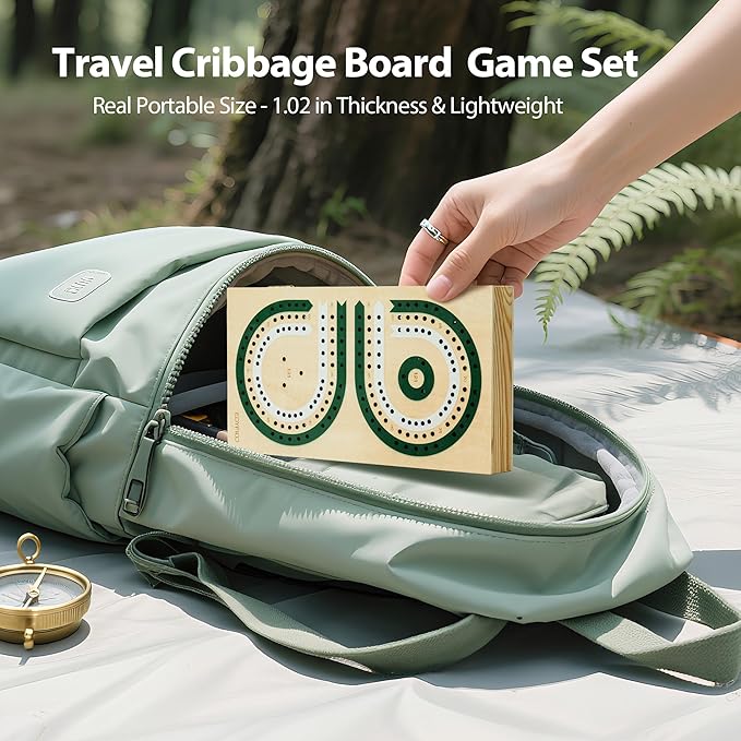 Foldable Cribbage Board Game Set, Solid Wooden Unique 3-Track Cribbage Board with Card Storage & Magnetic Closure, 9 Multi-Colored Pegs, Playing Cards, Family Travel Board Game for Gatherings & Gifts