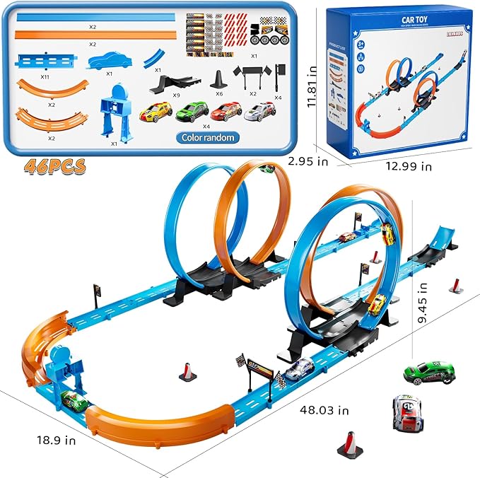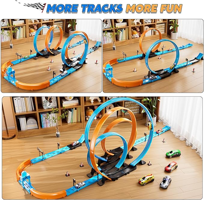 Toy Car Track Set for Boys Kids Age 3-5 4-7 8-12, Long Race Tracks with 4 Action Loops and 4 High-Speed Slot Cars, 35+ Pieces of Race Track to Create Multiple Configurations
