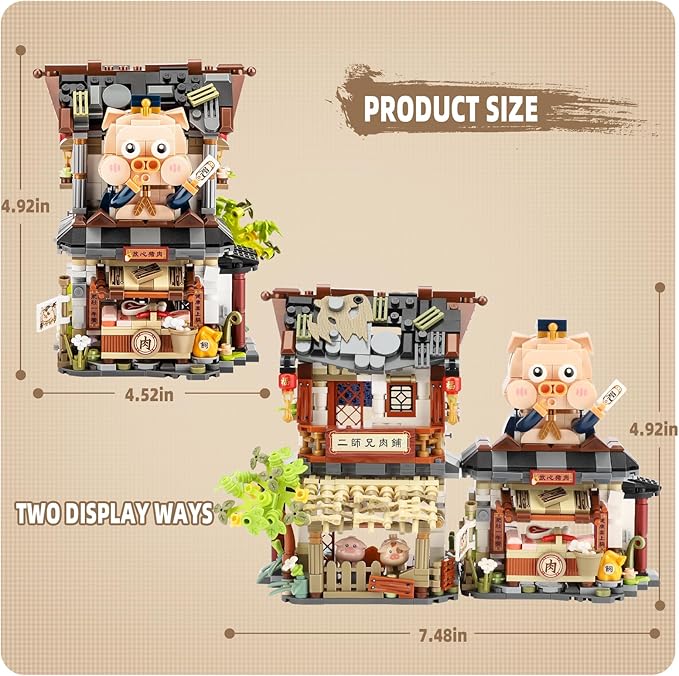 Chinese Street View Butcher Shop Mini Building Blocks, MOC Creative Building Toys Model Set for Girls 6-12 Years Old, 1105 PCS Simulation Architecture Construction Toy