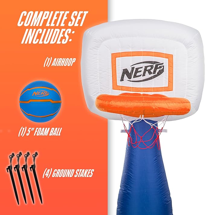NERF AirHoop Kids Inflatable Basketball Hoop Set - Instant Blow Up Youth Mini Hoop + Foam Basketball - Plug in Inflation in 10 Seconds - 4.5' Feet Kids Toy Basket + 5" Inch Mini Ball