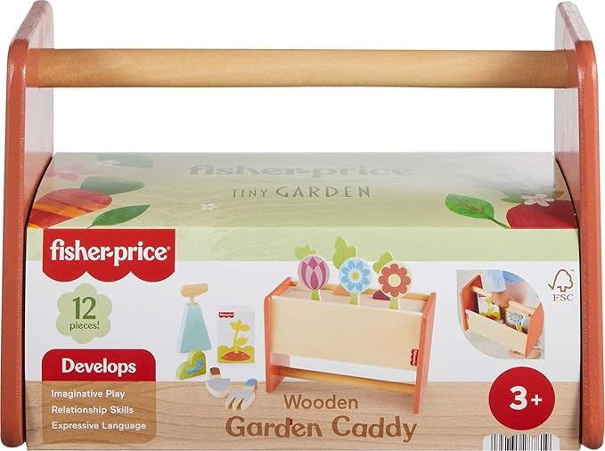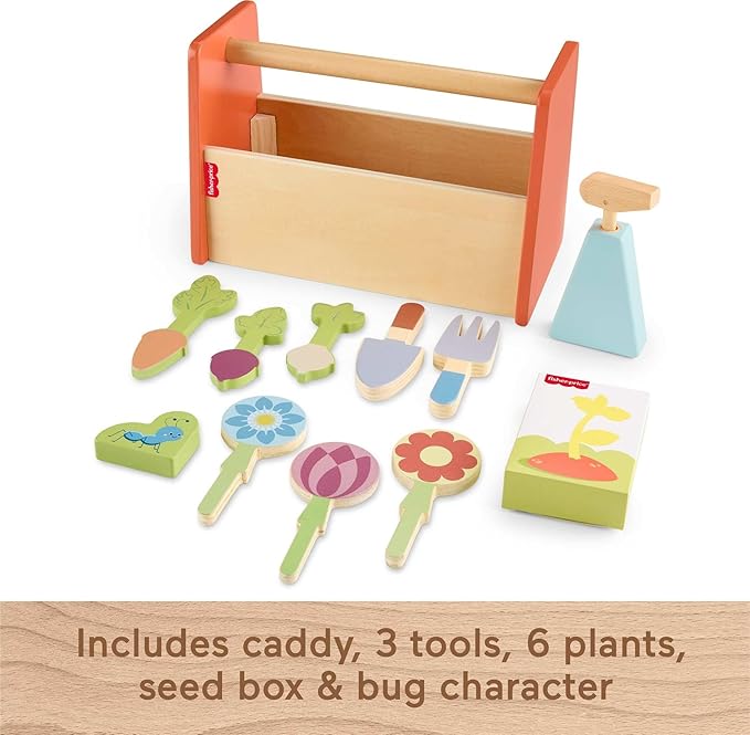 Fisher-Price Wood Pretend Play Toy Tiny Garden Caddy, 12-Piece Set with Wooden Tools & Plants for Preschool Kids Ages 3+ Years (Amazon Exclusive)