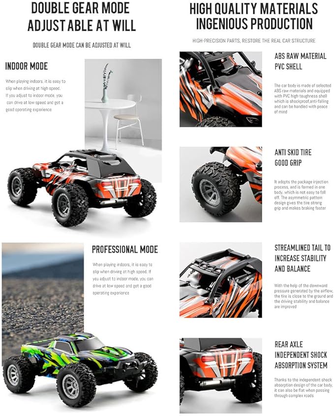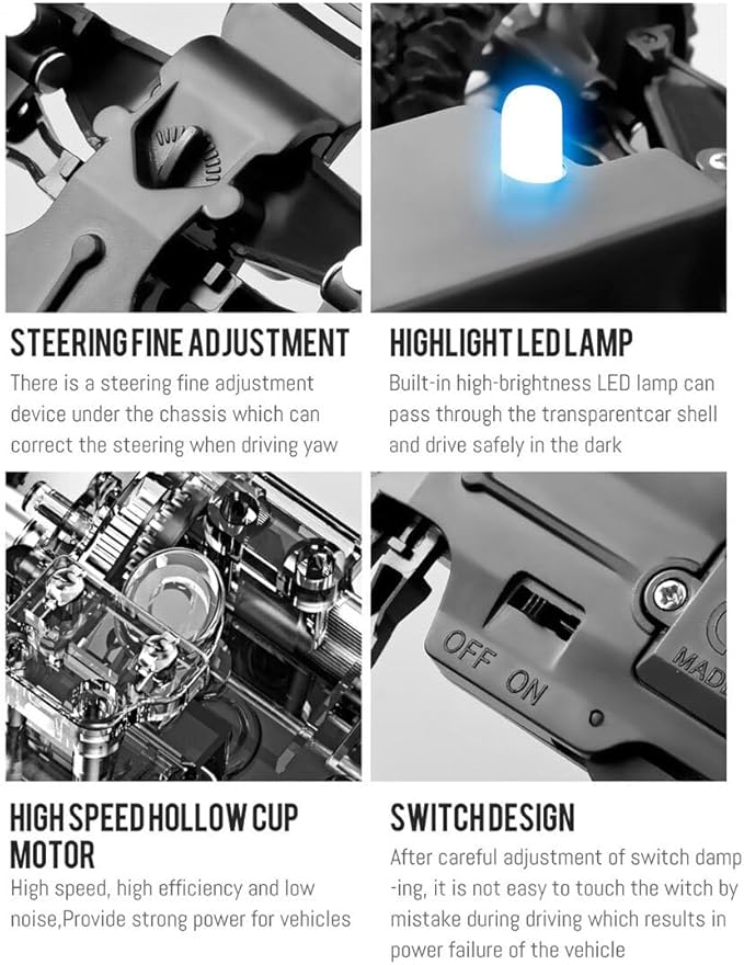 • Safe & Reliable: Multiple connecting rods of the chassis have a high passing and climbing performance. Featuring all metal universal drive shaft and has an anti-vibration body design. With battery overcharge protection and overcurrent protection to protect internal electronic components