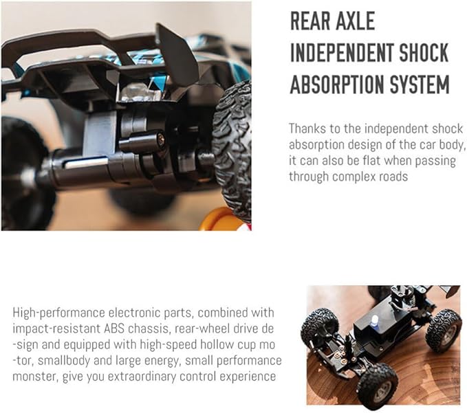• Safe & Reliable: Multiple connecting rods of the chassis have a high passing and climbing performance. Featuring all metal universal drive shaft and has an anti-vibration body design. With battery overcharge protection and overcurrent protection to protect internal electronic components