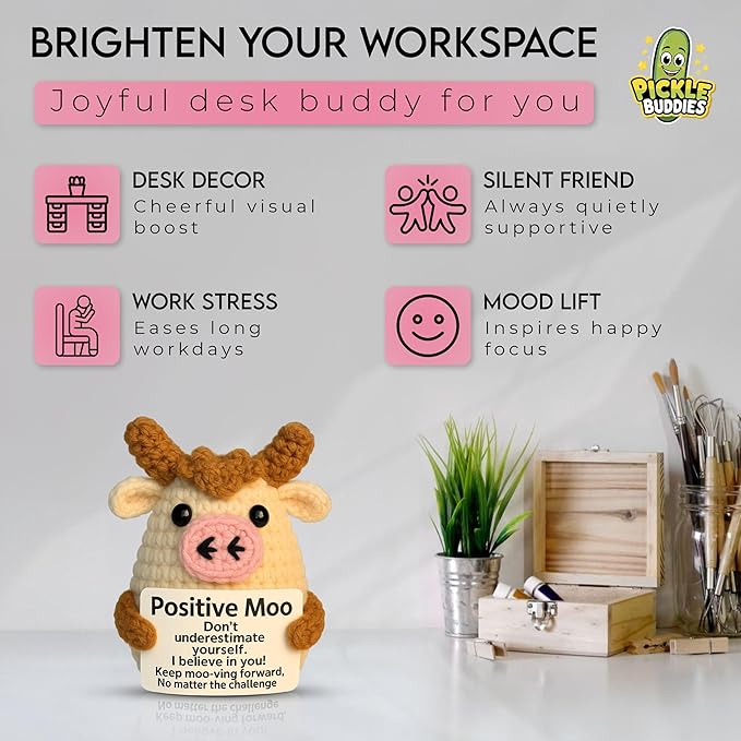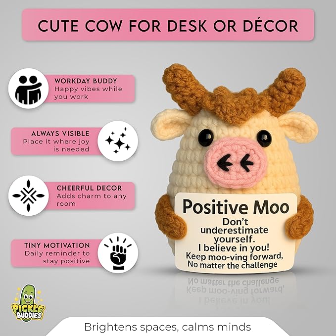 Positve Moo - Emotional Support Crochet Dolls Positive Crochet Animals Gifts Emotional Support Plush for Anxiety & Stress Relief Crochet Positive Cow Desk Decor