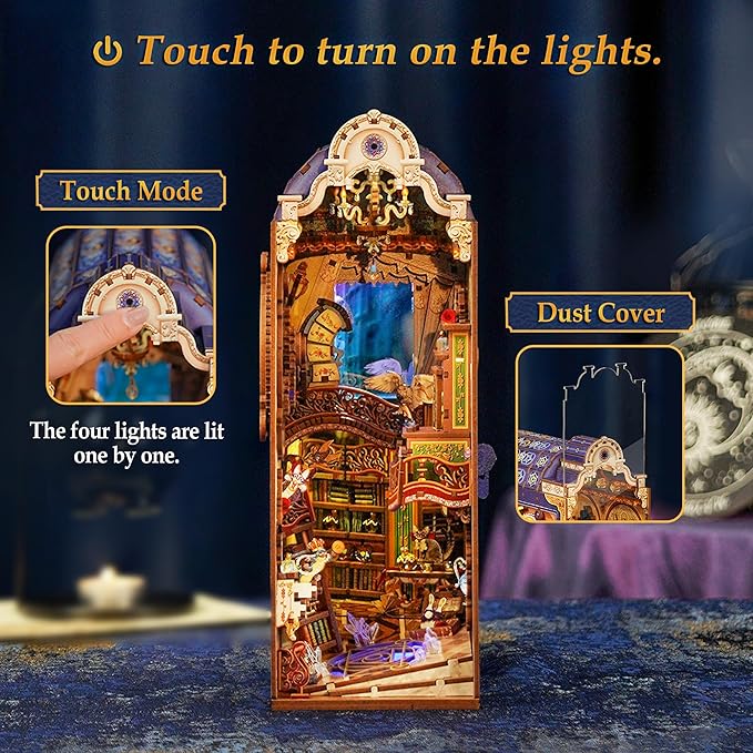 Tonecheer DIY Book Nook Kit for Adults, 3D Wooden Puzzle Bookend Miniature House Kit, Booknook Bookshelf Insert Decor with Dust Cover and LED Lights Gifts (Magical Library)