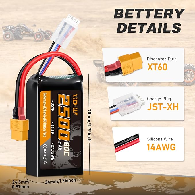 About This Specific Parameters: Dimensions: 70mm*34mm*24.5mm/ 2.75*1.34*0.97inch; Weight: 131g/4.6oz (per unit); Capacity: Real 2500mAh; Volt: 11.1V. Discharge Plug: XT60. Discharge... Read more
