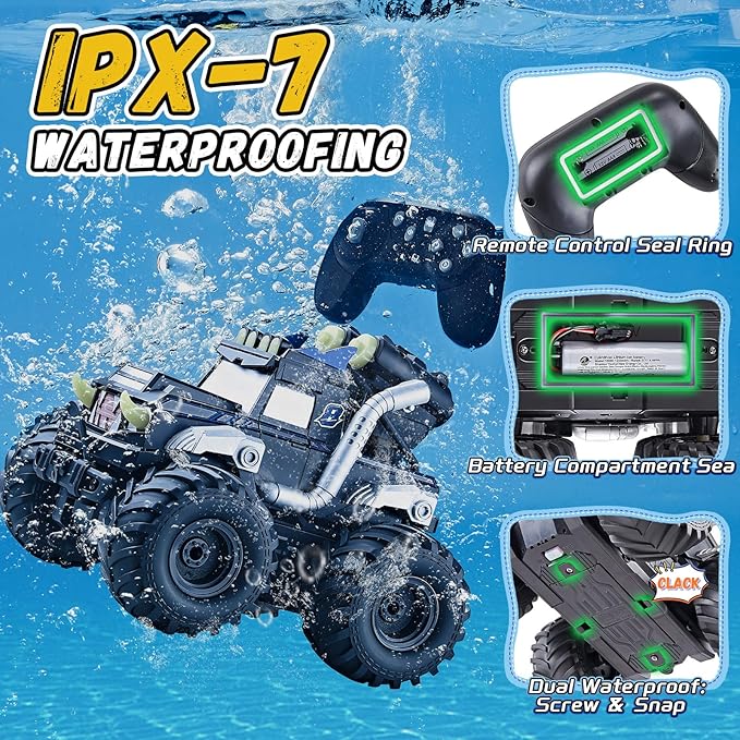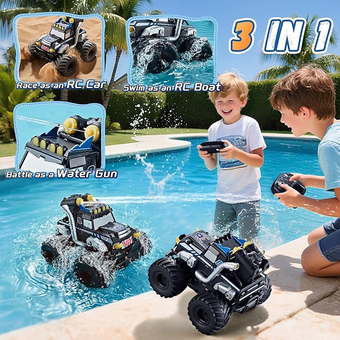3-in-1 Amphibious Remote Control Car, RC Boat/Water Gun, 2.4GHz All Terrain Waterproof Monster Trucks for Boys Age 4-7 W/2 Batteries 70 min, Birthday Gift Pool Toys for Kids Ages 4-8