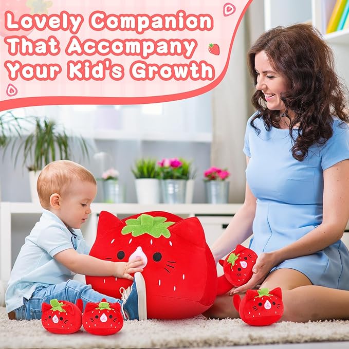 5 PCS Strawberry Cat Plush Stuffed Animal Family-19" Soft Strawberry Cat Plush, Large Mommy Plushies with 4 Baby Kittens Plushies, Kawaii Plushie Toy Christmas Birthday Gifts for Kids Boys