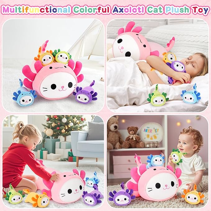 5 PCS Axolotl Cat Plush Stuffed Animal Family-19" Soft Axolotl Cat Plush, Large Mommy Plushies with 4 Baby Kittens Plushies for Kids, Kawaii Plushie Toy Christmas Birthday Gifts for Kids Boys Girls