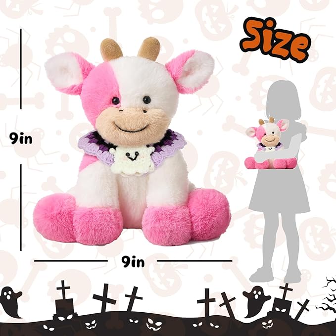 Hopearl Adorable Halloween Plush Cow Toy with Knitted Cute Ghost Bib Floppy Dairy Cattle Soft Stuffed Animal Gifts for Boys Girls Kids Toddlers, Pink, 9''