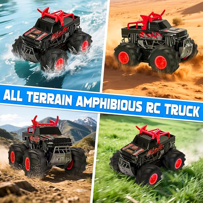 Remote Control Monster Truck Toys, 1:16 Amphibious Waterproof RC Car, 2.4GHz 4WD All Terrain Toys with 2 Rechargeable Batteries, Off-Road Truck Gifts for 6 7 8 9 10 11 12 Year Old Boys