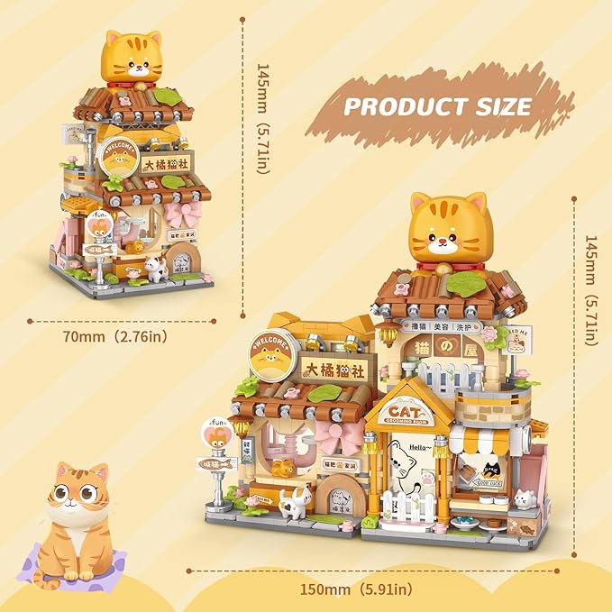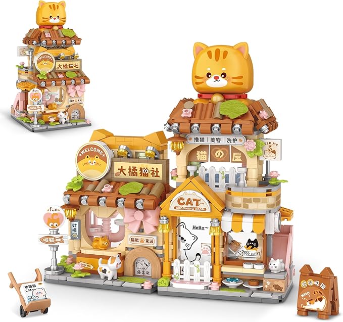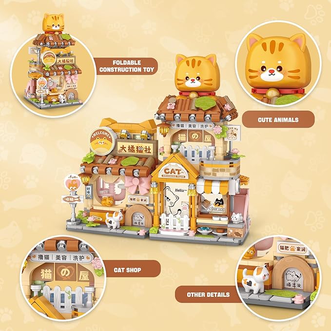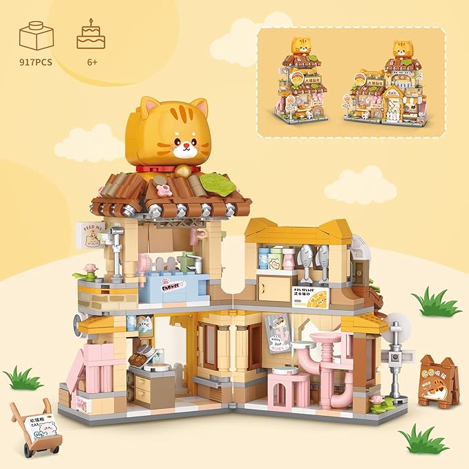Street View Cute Cat Shop Mini Building Blocks, MOC Creative Building Toys Cute Animals Building Set for Girls 6-12, Simulation Architecture Construction Toy, Gift Idea for Kids Adults (917 PCS)