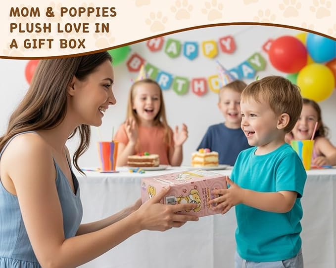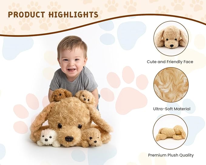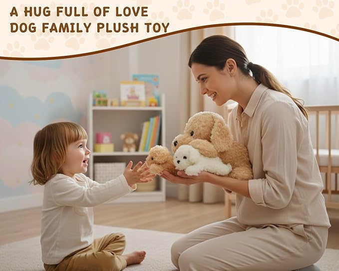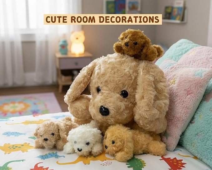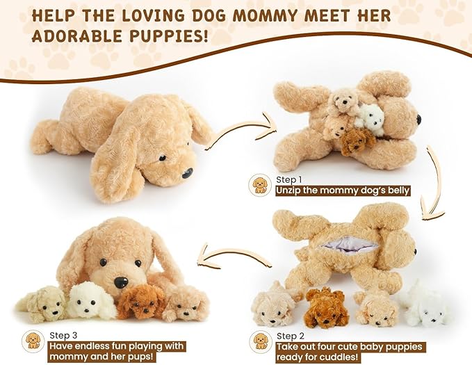 Chirpy Chums Classic Dog Family โ Mommy Labradoodle with 4 Puppies โ 17โ Ultra-Soft Plush Stuffed Animal Toy โ Zipper Belly Surprise for Cuddles, Play & Gifts โ 5-Piece Puppy Set for Kids Ages 3+