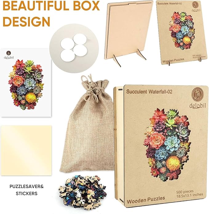 delobi Succulent Waterfall Wooden Puzzles, 500 Pieces Jigsaw Puzzles 18.5'' x13.1'', Unique Design Liberty Wooden Puzzles for Adults and Kids, Family Game Gift Royal Size