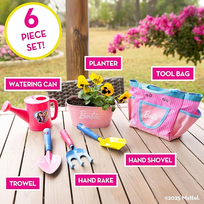 Barbie Garden Set – Real Gardening Tools for Kids with Watering Can, Metal Tools, Flower Pot and Storage Bag – Pink Tool Playset for Outdoors, 6 Pieces