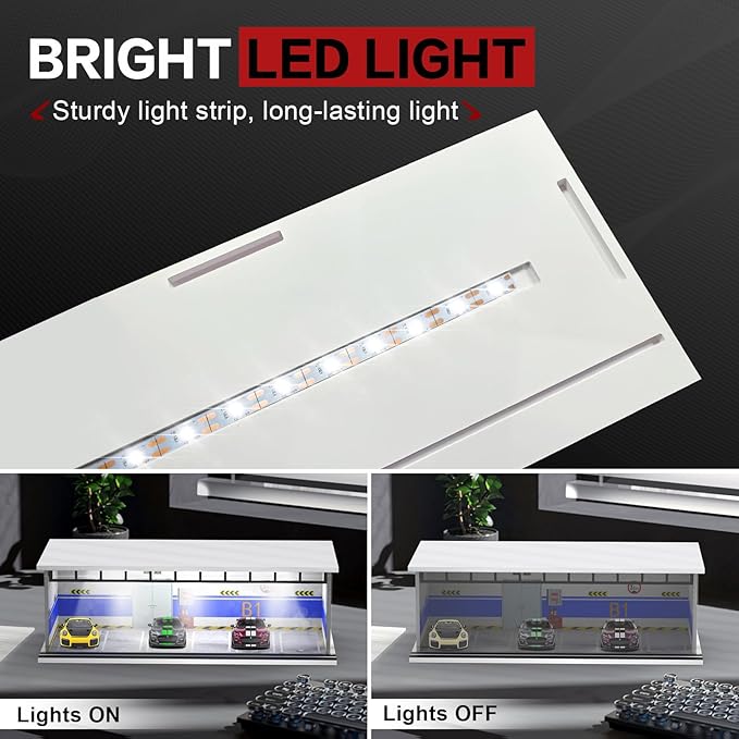 • 【Bright LED Light】The LED light is firmly attached to the top inside diorama box and is long-lasting. The model car display case will be illuminated with turning on the lights, increasing the atmosphere of the scene.