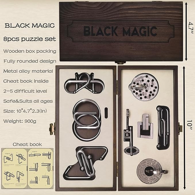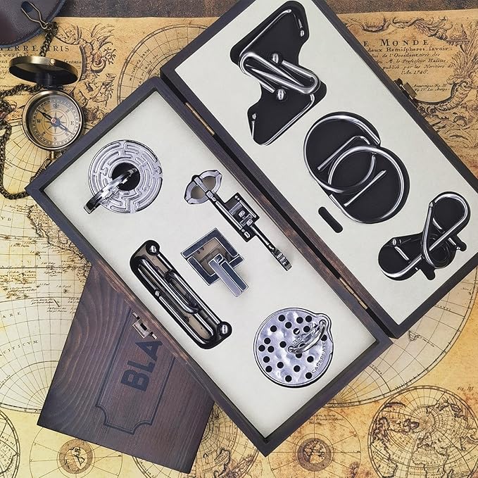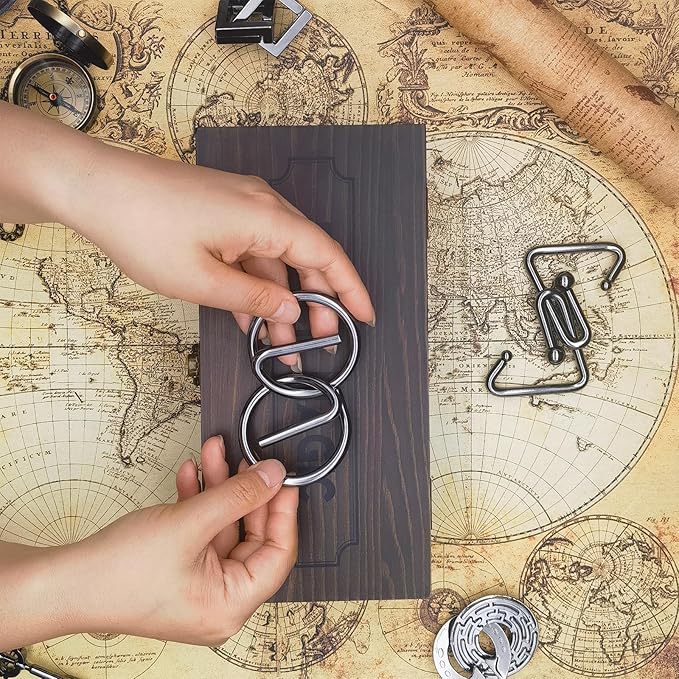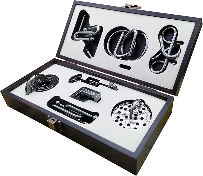 8-Piece 3D Metal Puzzle Box IQ Test Kit with Wooden Case, Brain Challenge for Adults Teens, Gift for Christmas, Valentine's Day, Birthday, Anniversary & Family Party Game