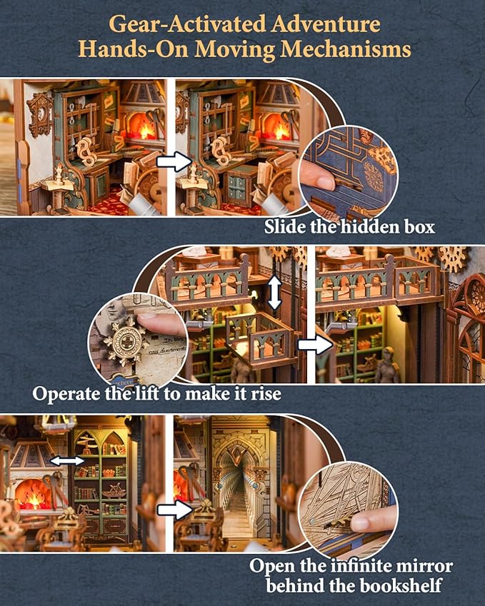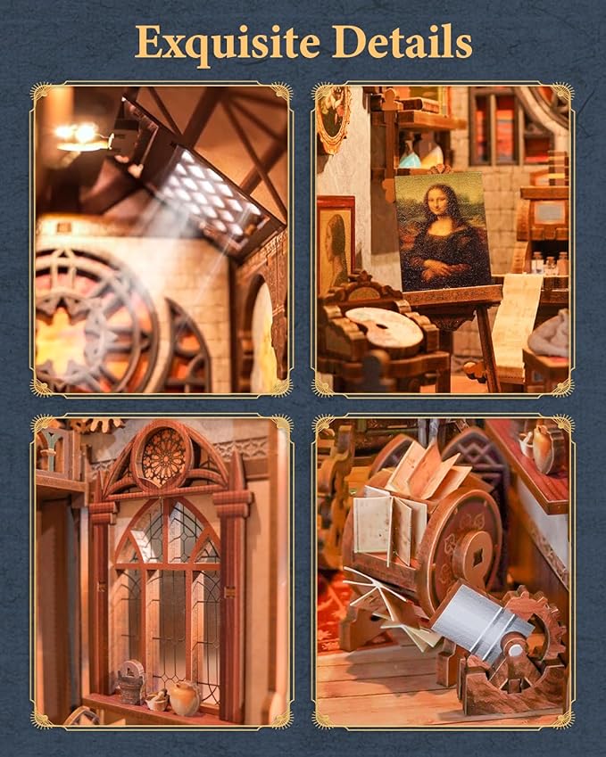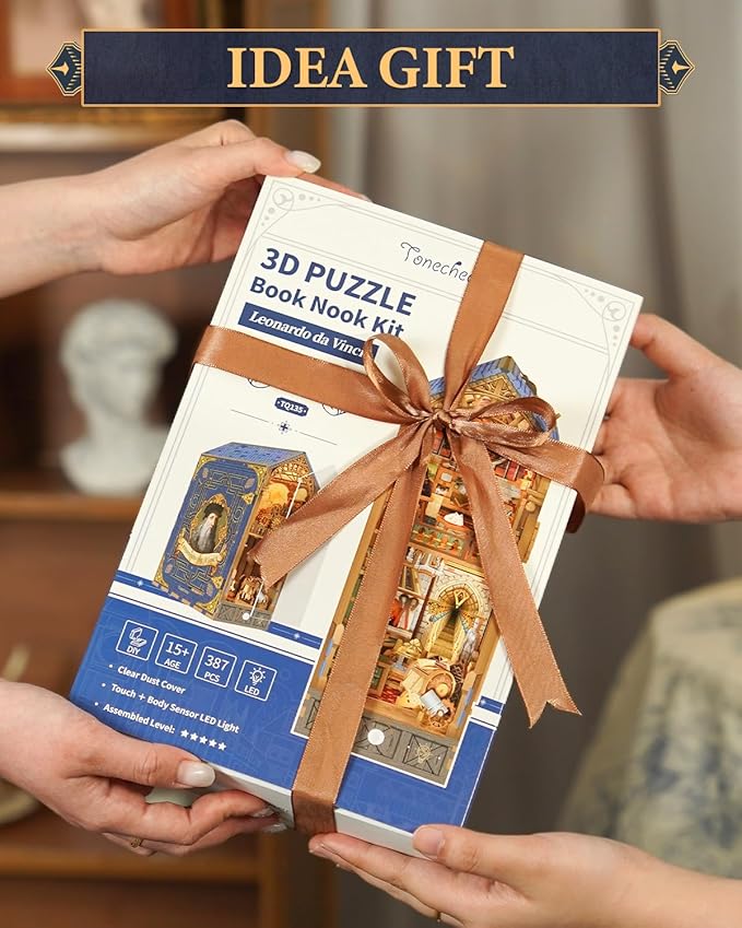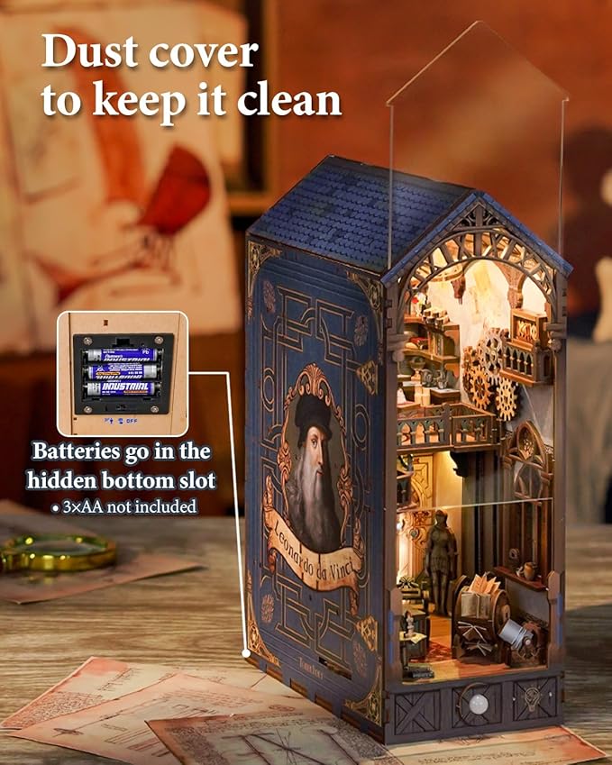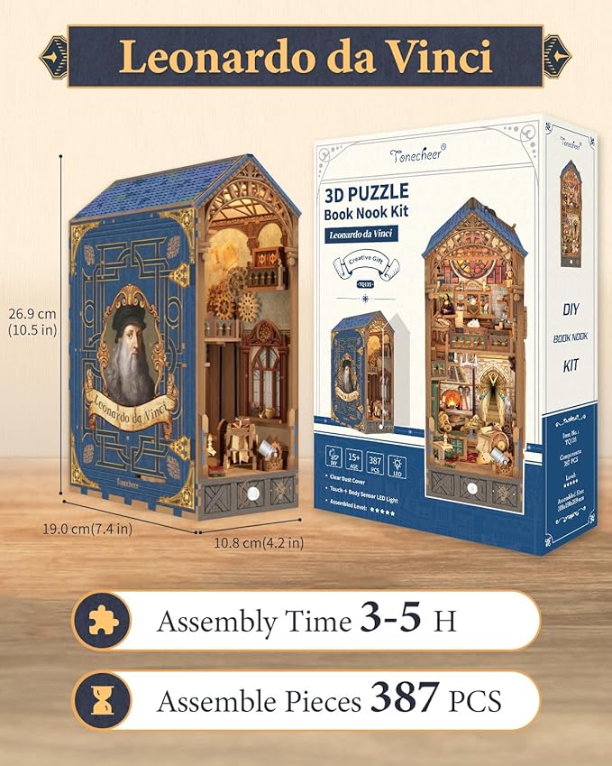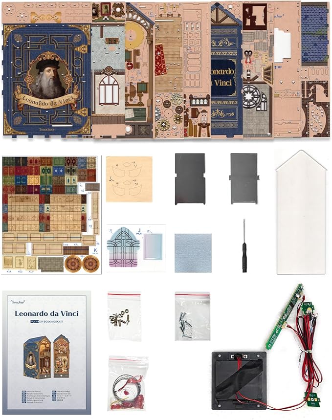 Tonecheer DIY Book Nook Kit for Adults, 3D Puzzle Wooden Miniature House Kit, Booknook Dollhouse Bookshelf Insert Decor Bookend with Dust Cover and LED Lights Gifts (Leonardo da Vinci)