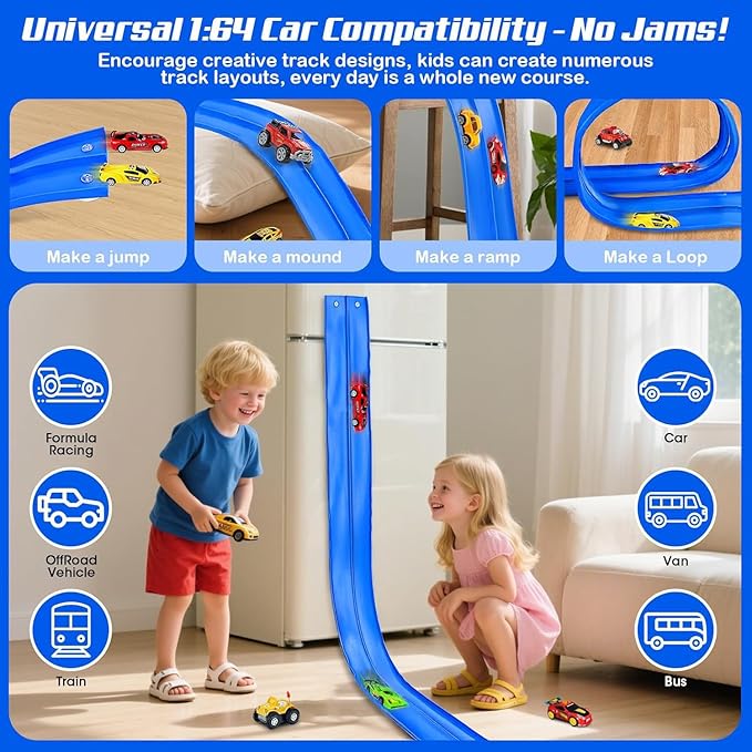 • 【Must Have for Car Lovers】Our flexible race car track changes the game, no assemble, encourage creative track designs, kds can create numerous track layouts, every day is a whole new course. The flexible race car track compatible with die-cast toy cars matchbox cars hot wheels cars monster trucks,1:64 Scale Vehicle,and more!!! Much better than other brands'repetitive/boring and unchanging track configuration, difficult to set up and clean up. (Car Not Included)