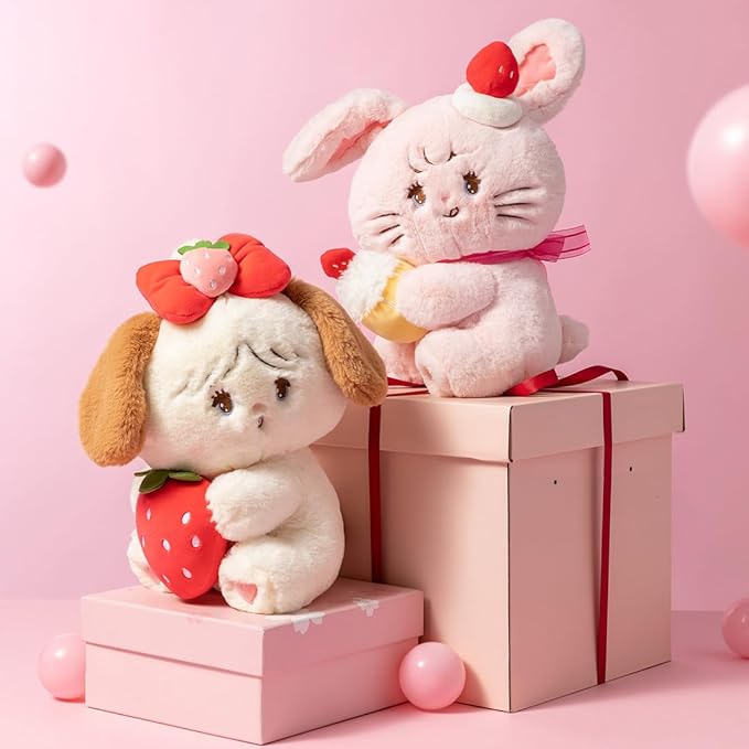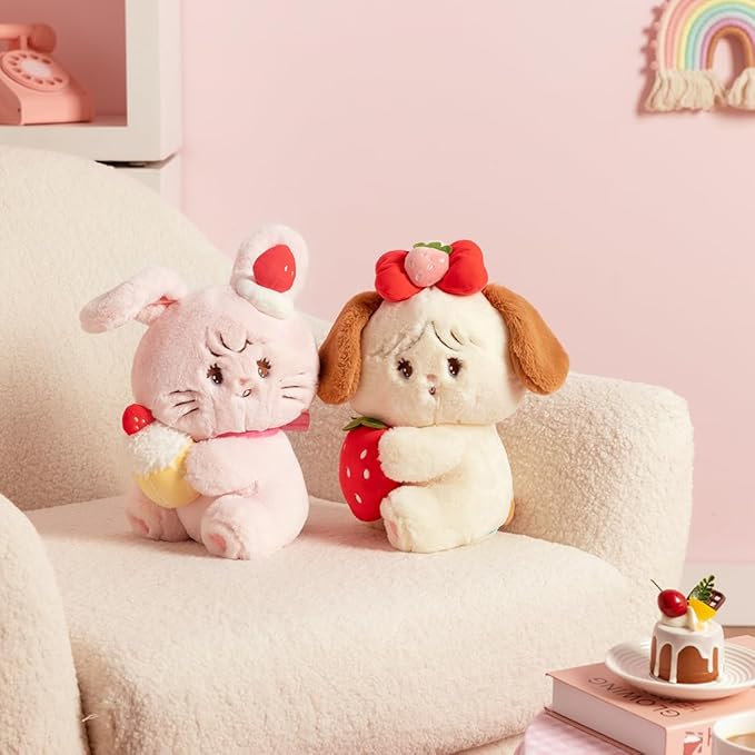 MINISO Mikko Bunny Cammy Plush Toy, 10" Strawberry Bunny Stuffed Animals, Sitting Soft Huggable Plush Dolls Cute Cartoon Cross-Dressing Gifts for Girls Birthday