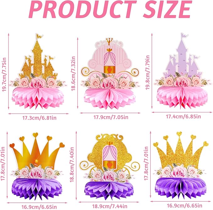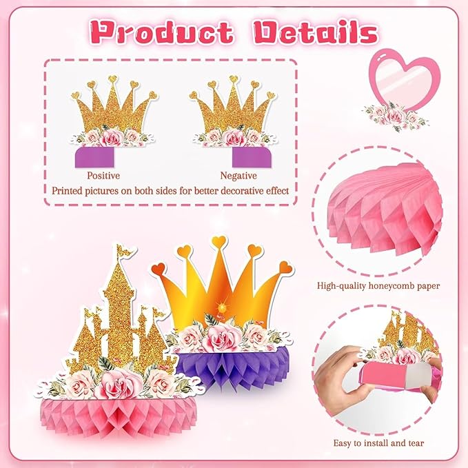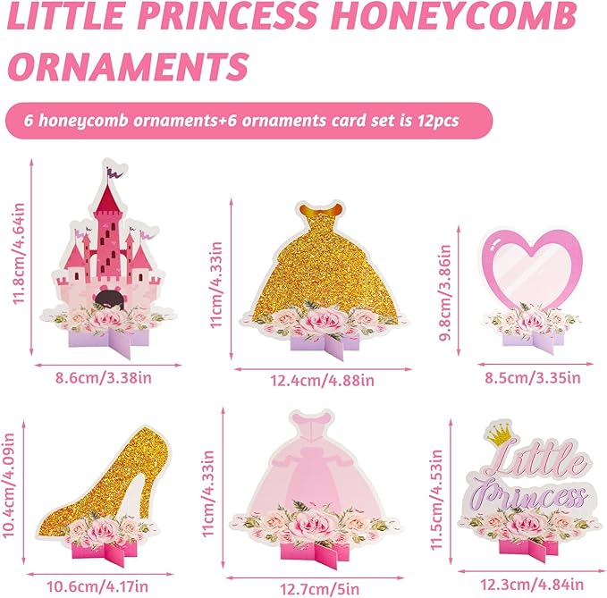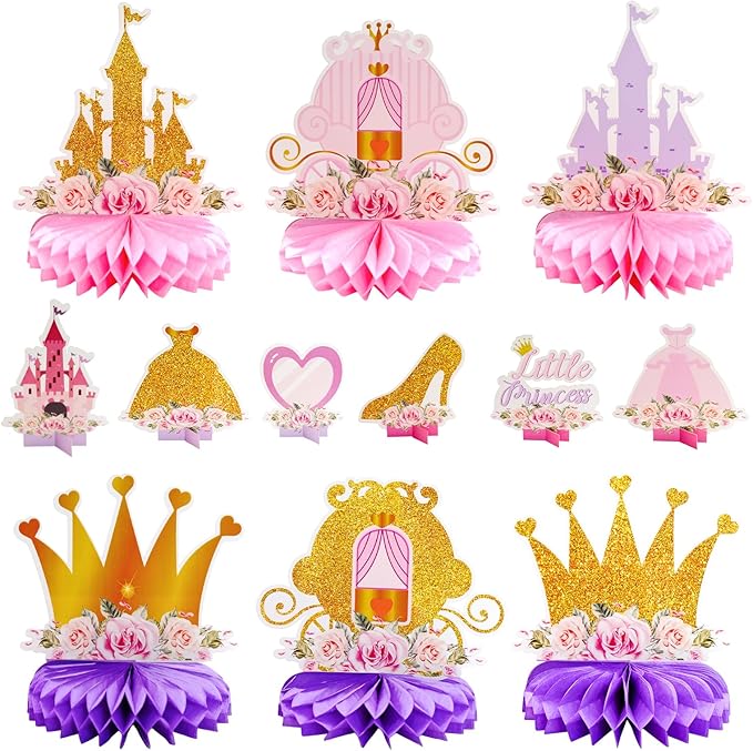 12 PCS Princess Party Honeycomb Centerpieces Decorations, Pink and Gold Party Table Topper Centerpieces for Girls Birthday Christmas Party (Princess Set)