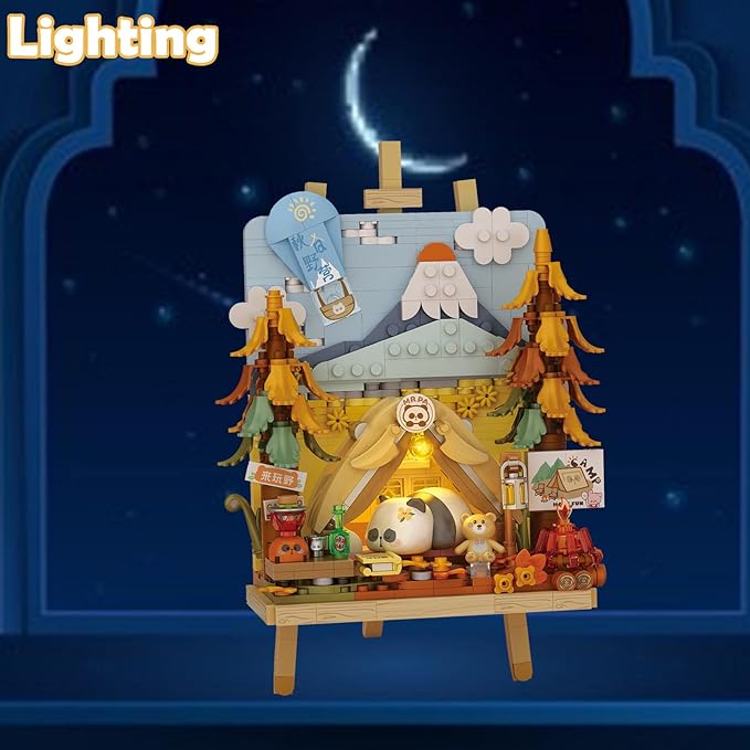 MEIEST Panda Mini Building Blocks Cute 3D Painting Model Set,Creative 4 Seasons' Views Collection Construction Building Bricks Toy,Home Decor (Autumn-Camping)