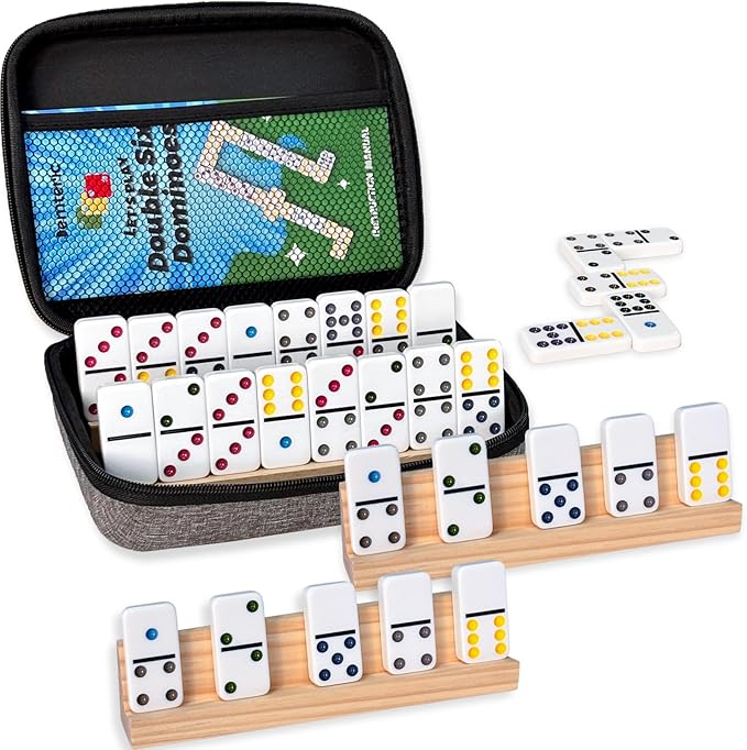 Demteric Upgraded Dominoes Double 6, 28 Dominos Tiles, 4 Wooden Holders/Racks Travel Memory Table Game with Portable Case for 2-4 Players Classic Family Board Games for Adults, Kids