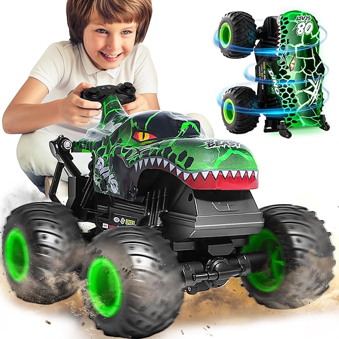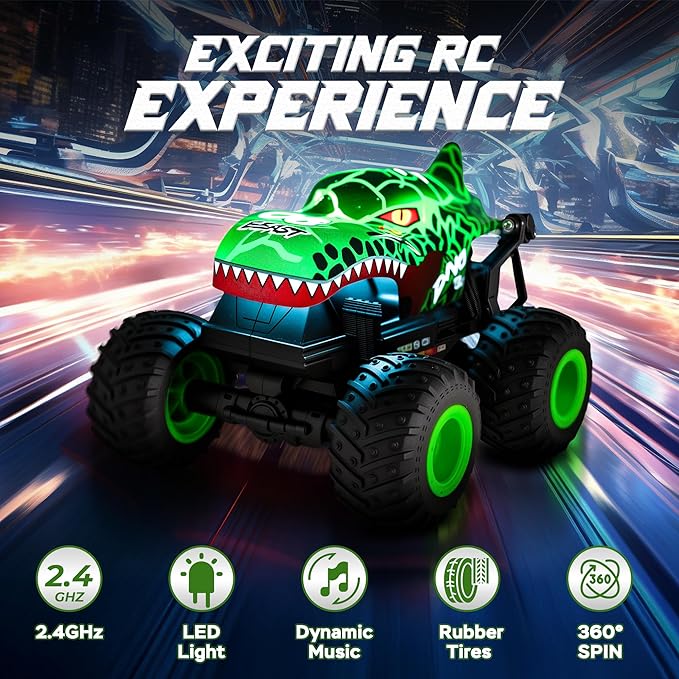 Remote Control Monster Truck - Dinosaur Monster Truck Toys with Music and Light, 1:20 Scale RC Truck with 360° Spins, Remote Control Car for Boys 4-7 for Kids Christmas Birthday Gifts