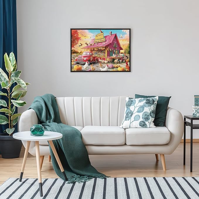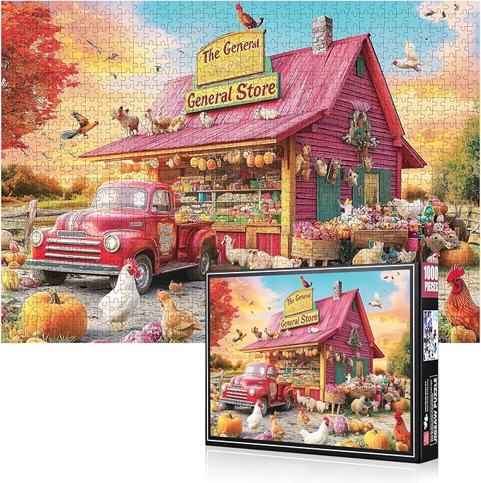 1000 Piece Jigsaw Puzzle for Adults – Country General Store with Red Vintage Truck, Farm Animals & Autumn Harvest | Challenging Puzzle for Relaxation, Brain Exercise & Gifts