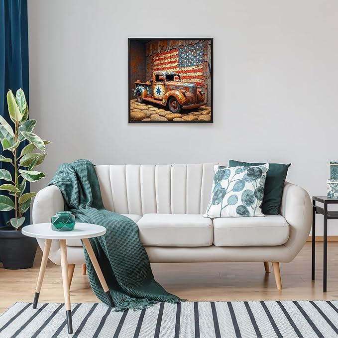 About This Rustic Patriotic Charm: Features a weathered vintage truck with star motifs, set against a faded American flag -... Read more