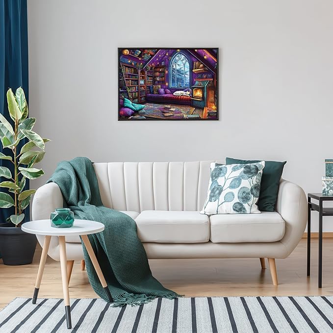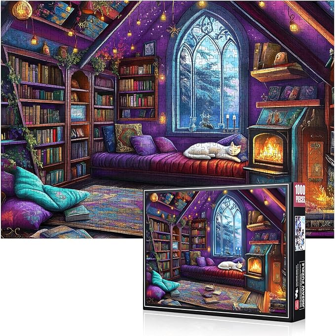 About This Enchanting Cozy Scene: This 1000 piece jigsaw puzzle for adults showcases a whimsical cat dream house with glowing... Read more