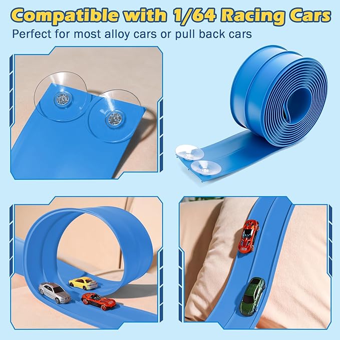 Flex Tracks 15 Ft Starter Set Flexible Race Track for Kids 3+, Race Car Ramp Track Compatible with Hot Wheels and Diecast 1/64th Cars, Portable Rolls Up Race Tracks with Strong Suction Cups