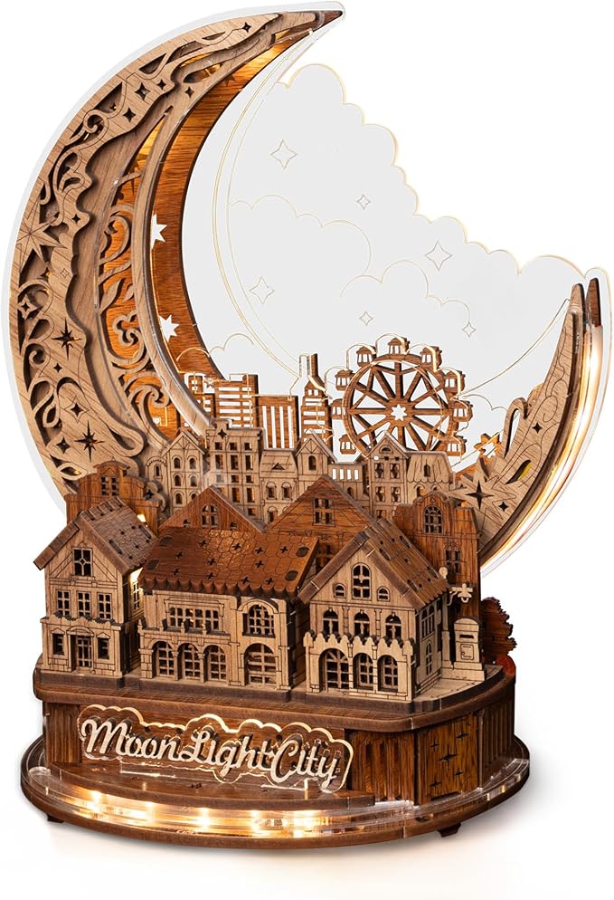 3D DIY Puzzle Moon City Model - LED 3D Wood Puzzle - 3D Wooden Puzzles for Adults Home Décor Gifts for Kids and Adults, Brown