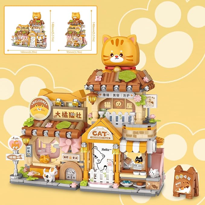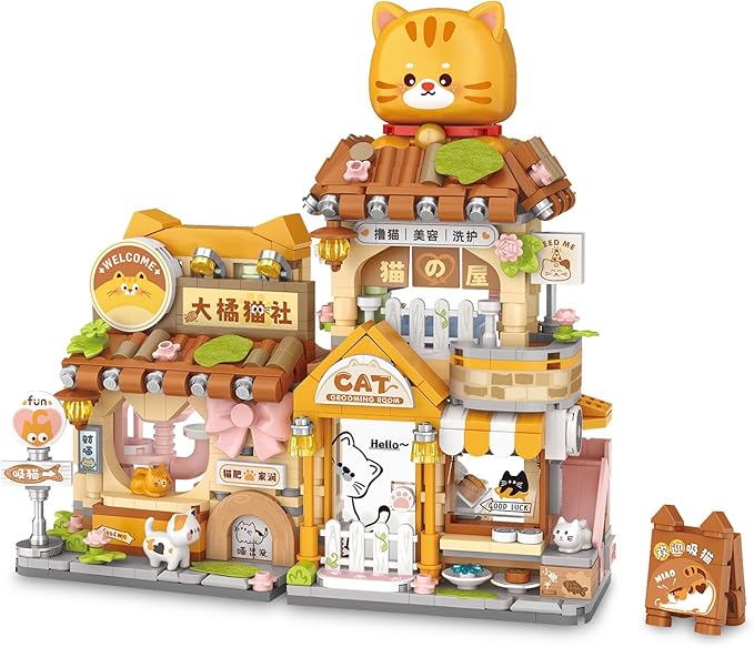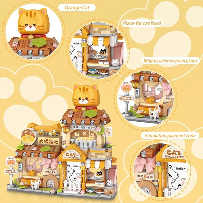 Cute Cat Mini Building Blocks Set, 917PCS MOC Mini Architecture Building Kits with Grooming Store Street View Design - STEM Educational Construction Gift for Girls Boys Kids Adults