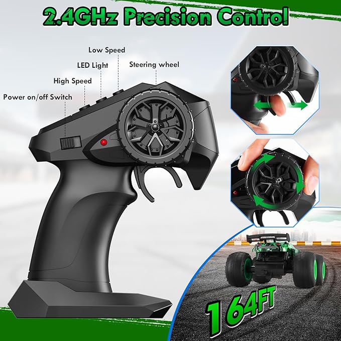 Remote Control Car, 1:18 Rc Cars, All-Terrain RC Truck with LED Light, 20KM/H, Rechargeable, 2WD, 2.4GHz, Sturdy PVC Shell, Remote Control Truck for Boys 4-7 8-12, Beginner (Green)