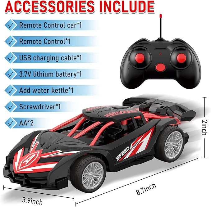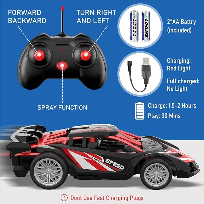 1/18 RC Car for Kids with Rechargeable Battery, LED Lights & Spray - Remote Control Car for Boys, Small RC Drift Cars for Ages 4-7 (Black & Red)