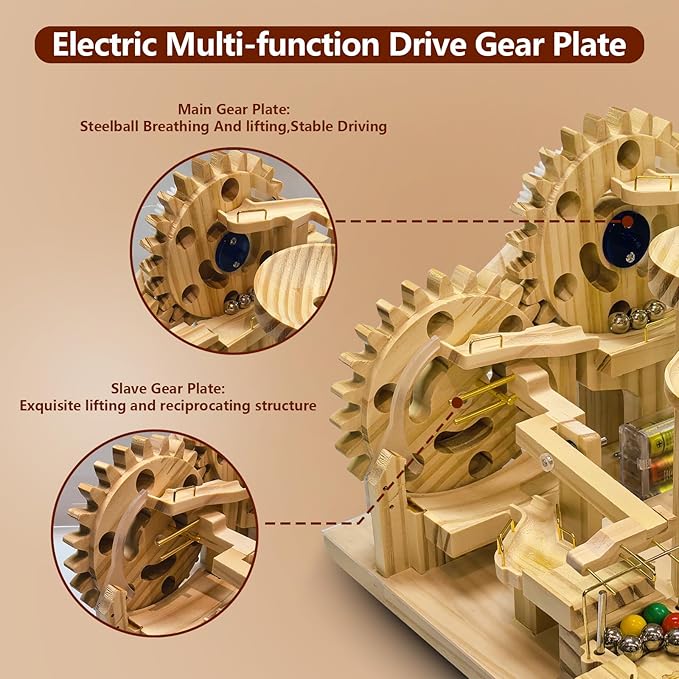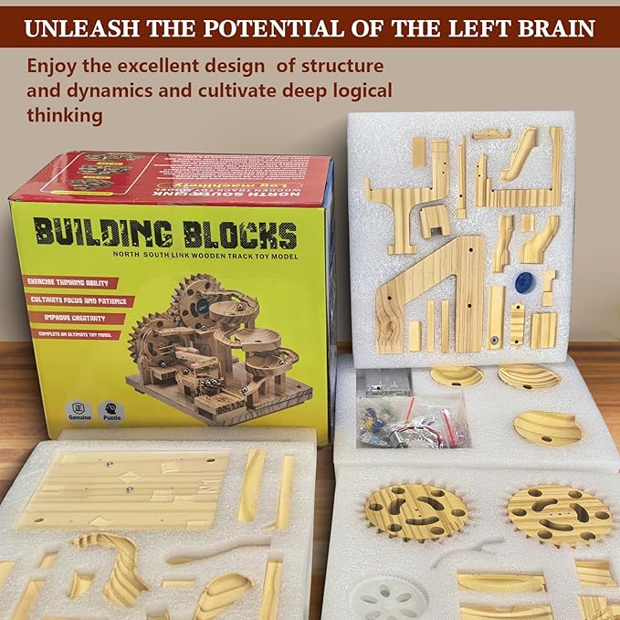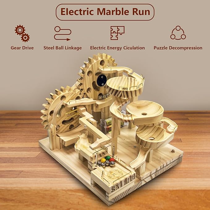 Wooden Marble Run Building Set, Electric Motorized, 41 Blocks, 15 Marbles, 3D Brain Teaser Construction Kit.for Adults and Adolescent to Build (SN-113)