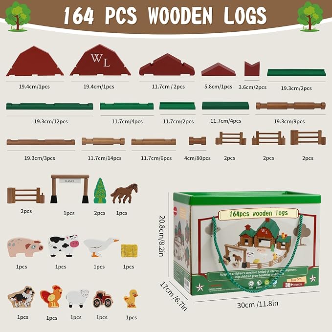 Wondertoys 164 Pcs Wooden Log Set Ranch Real Wood Logs Classic Building Log Ages 3+ Best Retro Farm Building Gift Set Creative Construction Engineering Educational Gifts