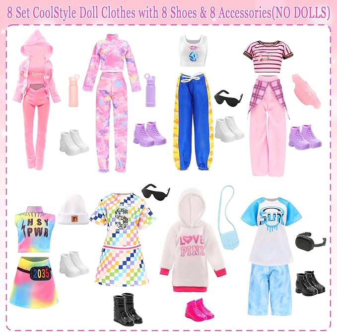 24 PCS Doll Clothes & Accessories 8 Set Clothing Includes Sport Outfit, Hooded Dress, Sportsuits, Skirt, with 8 Pairs of Shoes, 8 Accessories for 11.5 Inch Girl Dolls Cool Style Set
