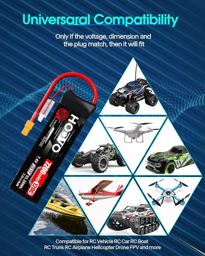 HOOVO 2S Lipo Battery, 7.4V 7200mAh 120C RC Battery Pack,Softcase with XT60 Plug for RC Car Truck Buggy Crawler Airplane Boat RC Vehicle,2Packs