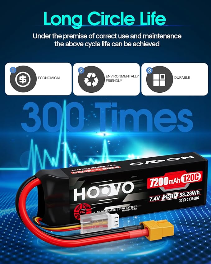 About This 2S Lipo battery Specification - Cells Number: 2; Voltage: 7.4V; Capacity: 7200mAh; Discharge: 120C; Cell voltage: 3.2~4.2V; Discharge... Read more