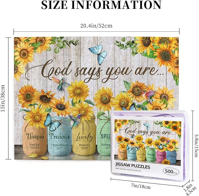 Christian Wooden Jigsaw Puzzle 500 Pieces for Adults - Inspirational Sunflower & Scripture, God Says You are Religious Gift for Women, Faith-Based Home Decor
