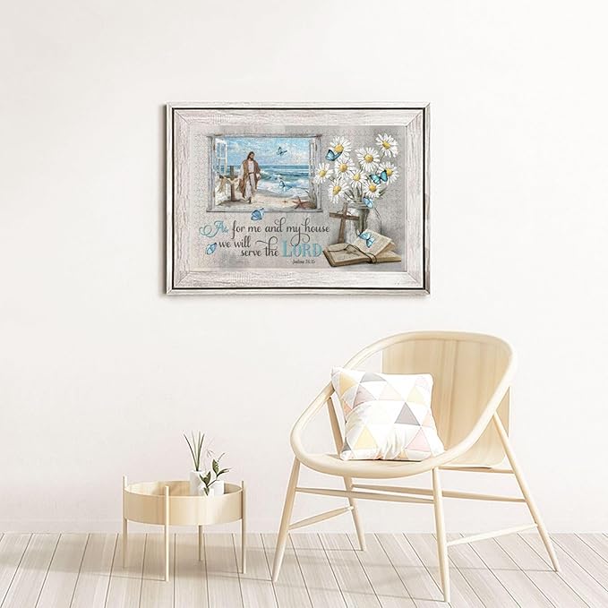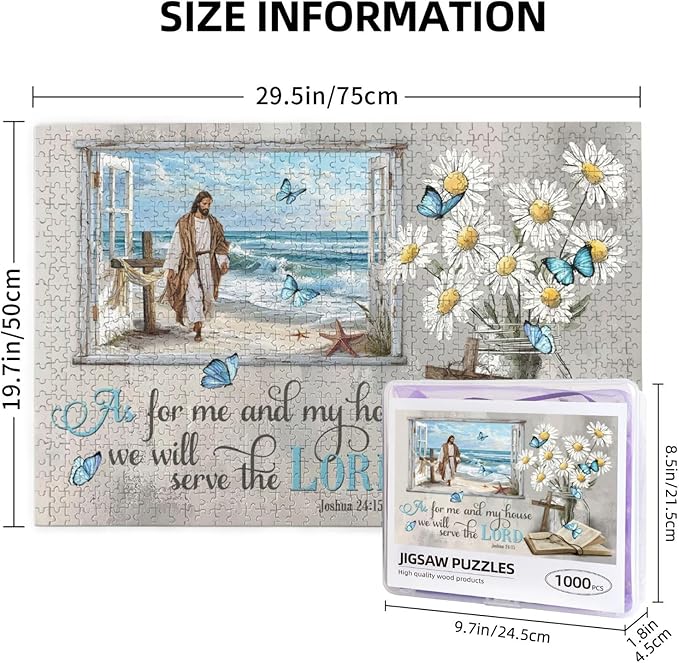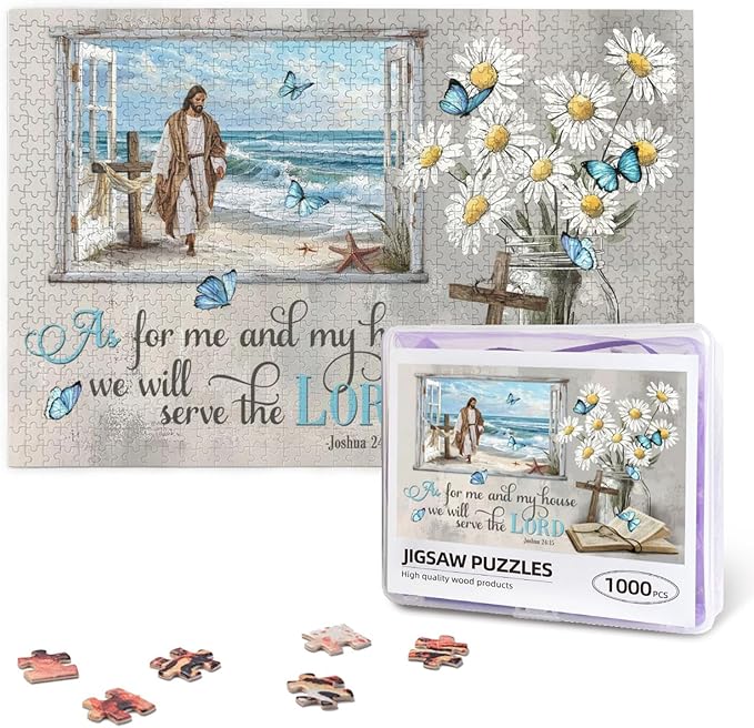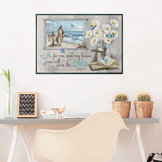 Christian Wooden Jigsaw Puzzle 1000 Pieces for Adults - Jesus Walking on Beach & Joshua 24:15 Bible Verse, Religious Scripture Art for Stress Relief, Inspirational Home Decor and Gift