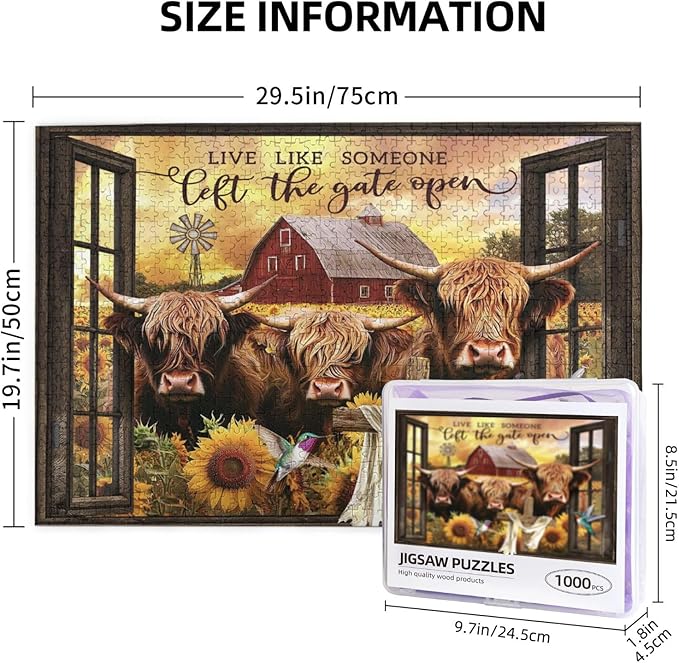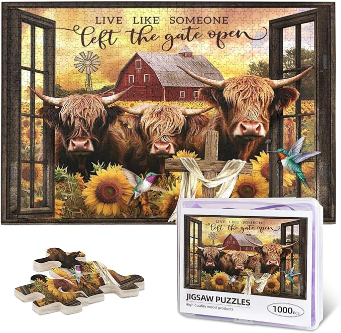 Highland Cow Jigsaw Puzzles 1000 Pieces for Adults, Farm Animal & Sunflowers Country Scene, Rustic Window View Wooden Puzzle, Relaxing Nature Art & Farmhouse Decor Gift